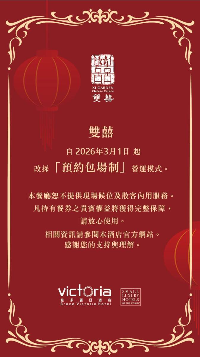 感謝您對雙囍中餐廳長久以來的支持。自 2026 年 3 月 1 日起,本餐廳將由雲品國際旗下君品 Collection接手營運,並轉型為「預約包場制」的餐飲空間,由專業團隊為您量身打造專屬饗宴。