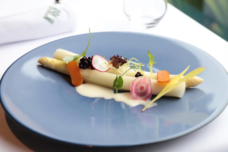 Featuring premium seasonal European white asparagus, gently blanched to preserve its tender texture.